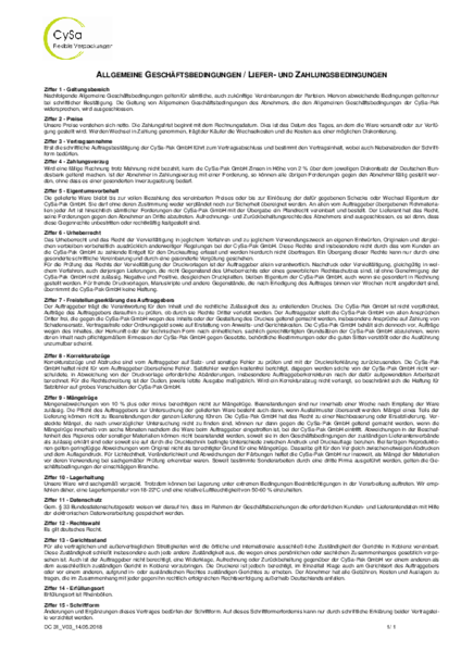 Korrekturabzüge und Abdrucke sind vom Auftraggeber auf Satz- und sonstige Fehler zu prüfen und mit der Druckreiferklärung zurückzusenden. Die CySa-Pak GmbH haftet nicht für vom Auftraggeber übersehene Fehler. Satzfehler werden kostenfrei berichtigt, dagegen werden solche von der CySa-Pak GmbH nicht ver-schuldete, in Abweichung von der Druckvorlage erforderliche Abänderungen, insbesondere Auftraggeberkorrekturen nach der dafür aufgewendeten Arbeitszeit berechnet. Für die Rechtschreibung ist der Duden, jeweils letzte Ausgabe maßgeblich. Wird ein Korrekturabzug nicht verlangt, so beschränkt sich die Haftung für Satzfehler auf grobes Verschulden der CySa-Pak GmbH.
